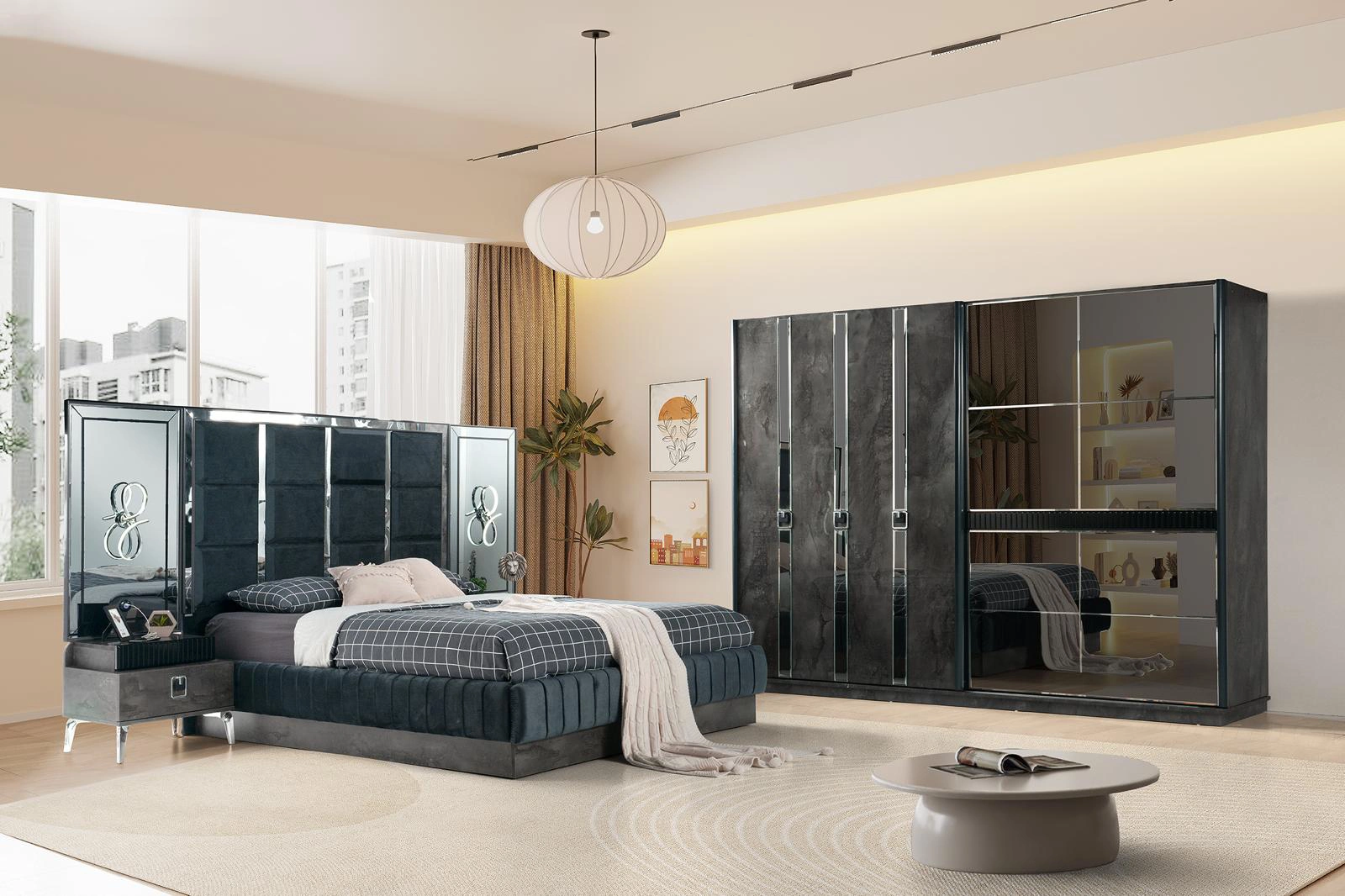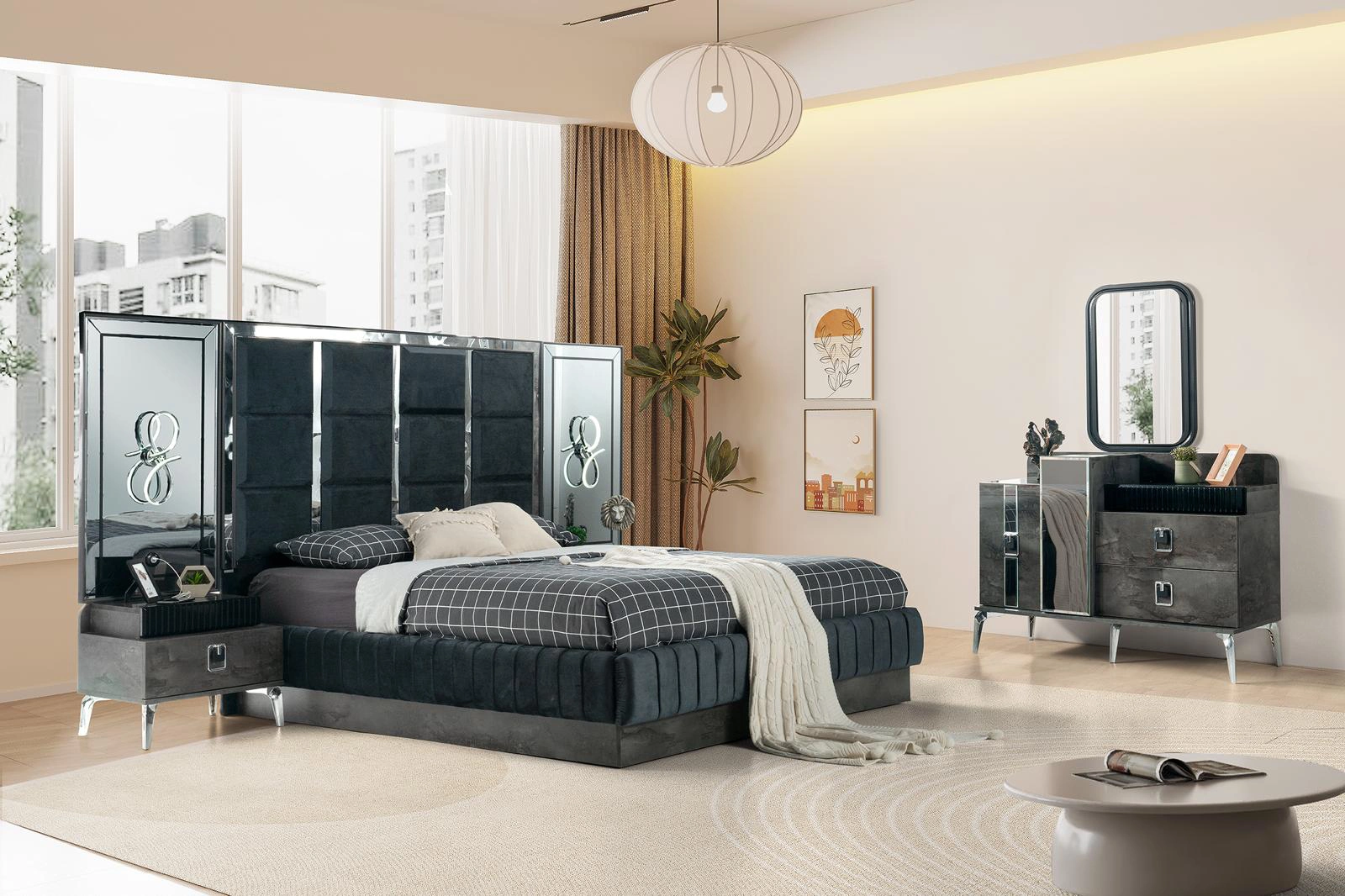 Creëer een luxe en stijlvolle sfeer in uw slaapkamer met deze moderne slaapkamermeubelset. Inclusief een comfortabel bed, ruime kledingkast en elegante nachtkastjes. Hoogwaardige afwerking en eigentijds ontwerp, perfect voor elk interieur. Transformeer uw slaapkamer vandaag!